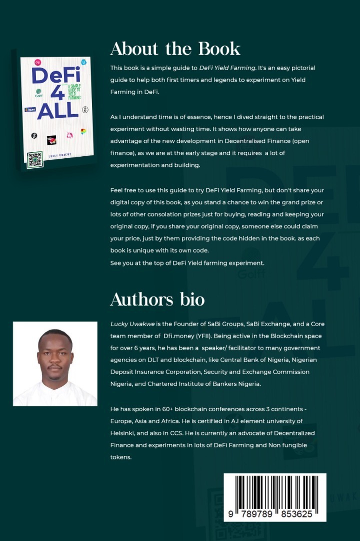 This book is a simple guide to decentralized Finance(DeFi), DeFi Yield Farming. It's an easy pictorial guide to help both first-timers and legends to experiment on Yield Farming in DeFi.